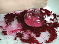 まずピグメントの中に少しづつ油をたらし、へらなどで馴染ませていきます。この時へらはステンレスや木などの絵具の粉との金属反応をおこさせない素材のものを使います。 油は一度に沢山まぜ過ぎないように気をつけて少しづつ混ぜていきます。 |